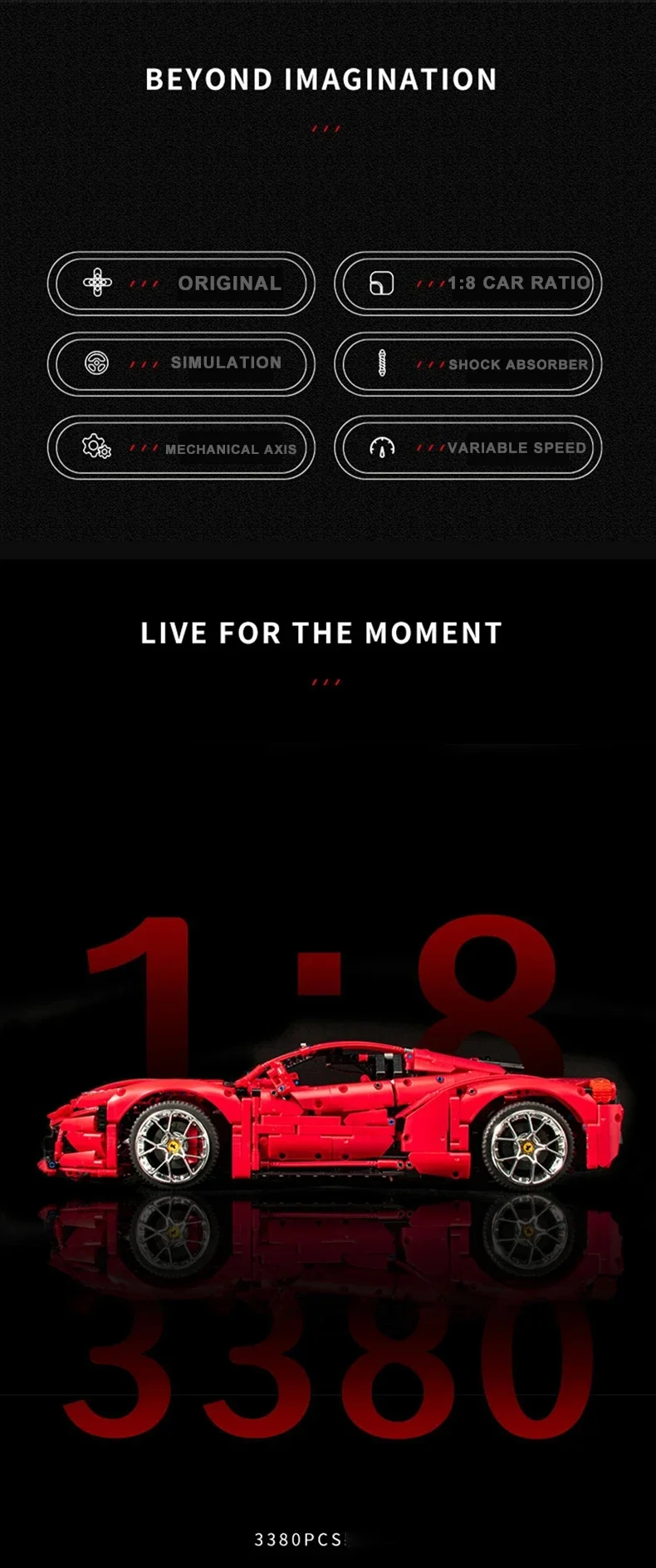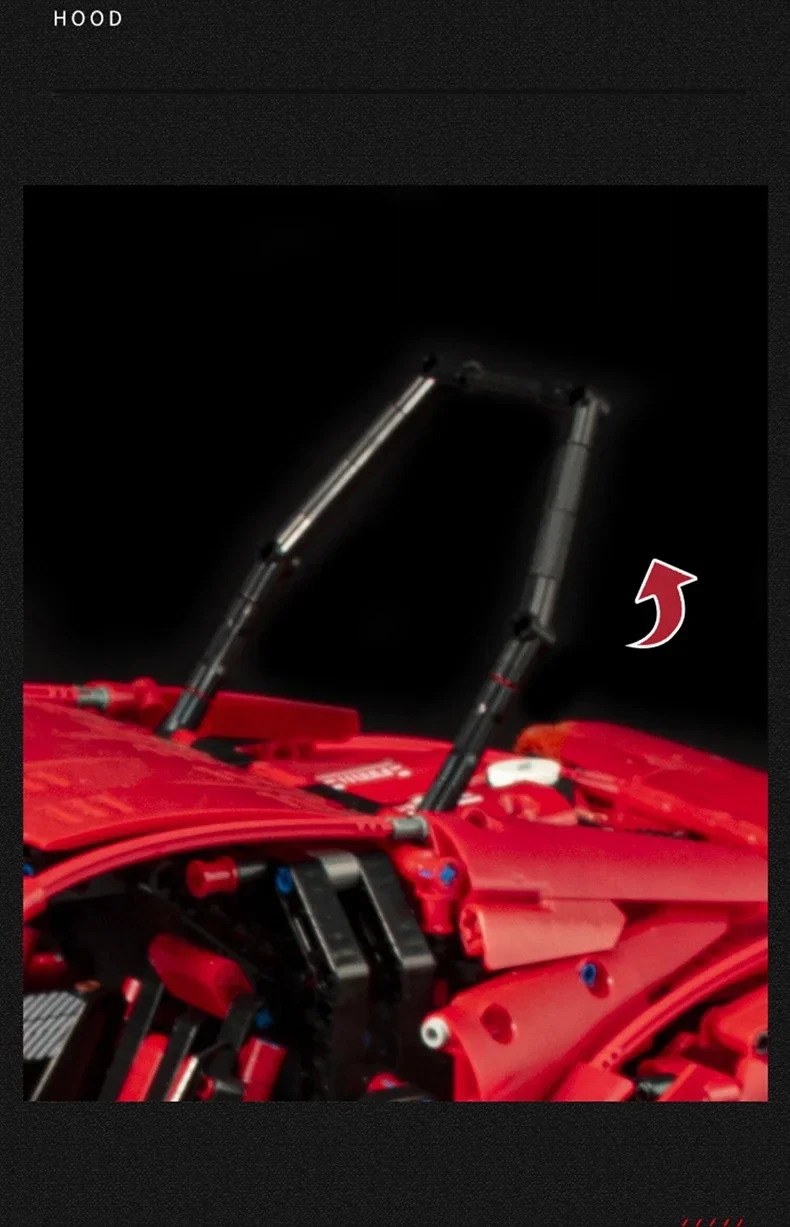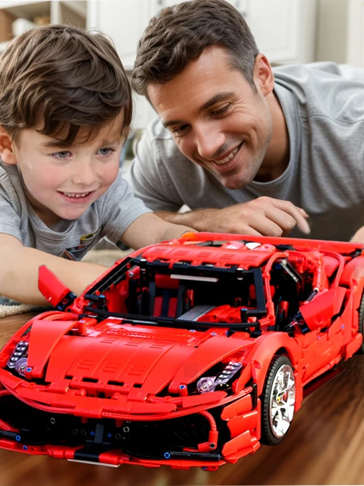 Crafted from high-quality ABS material—✅ non-toxic, ✅ durable, ✅ fade-resistant. The 3,380 precision-cut pieces form a 1:14 scale replica with eye-catching red exterior, aerodynamic curves, and detailed features: movable spoilers, realistic rims, and detachable interior components.