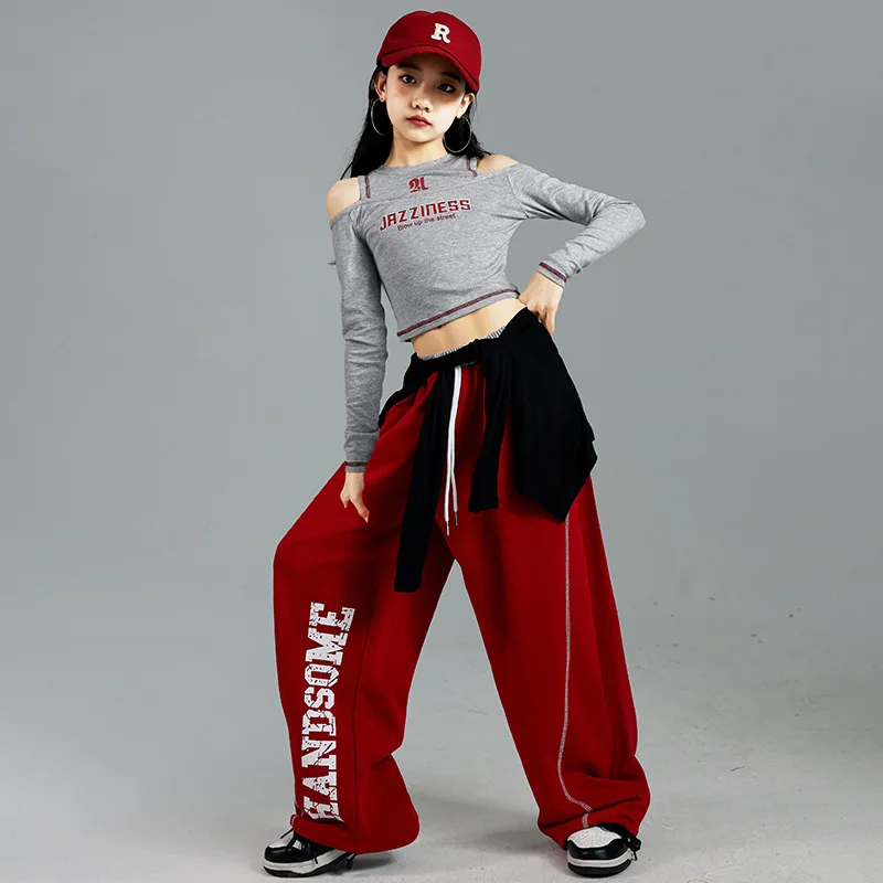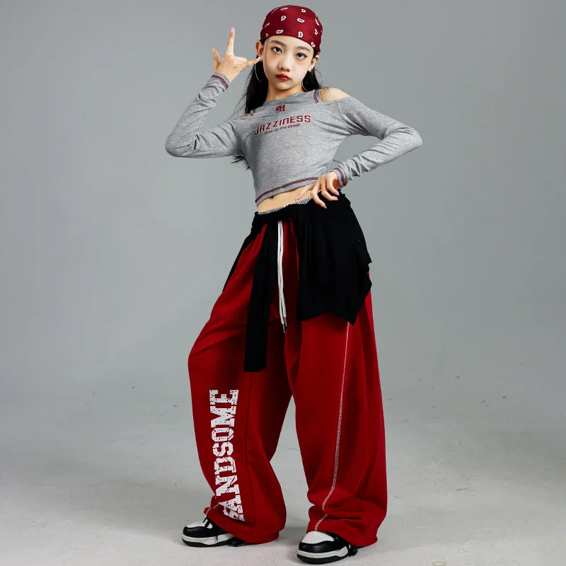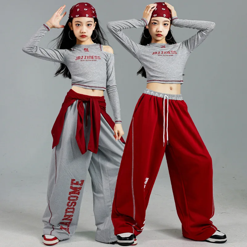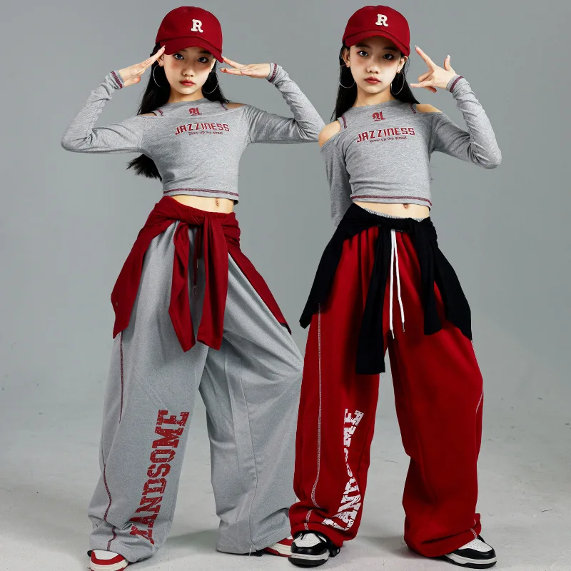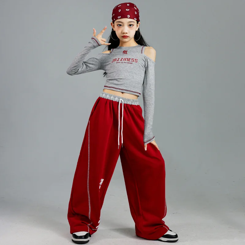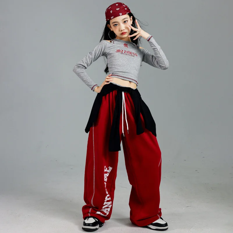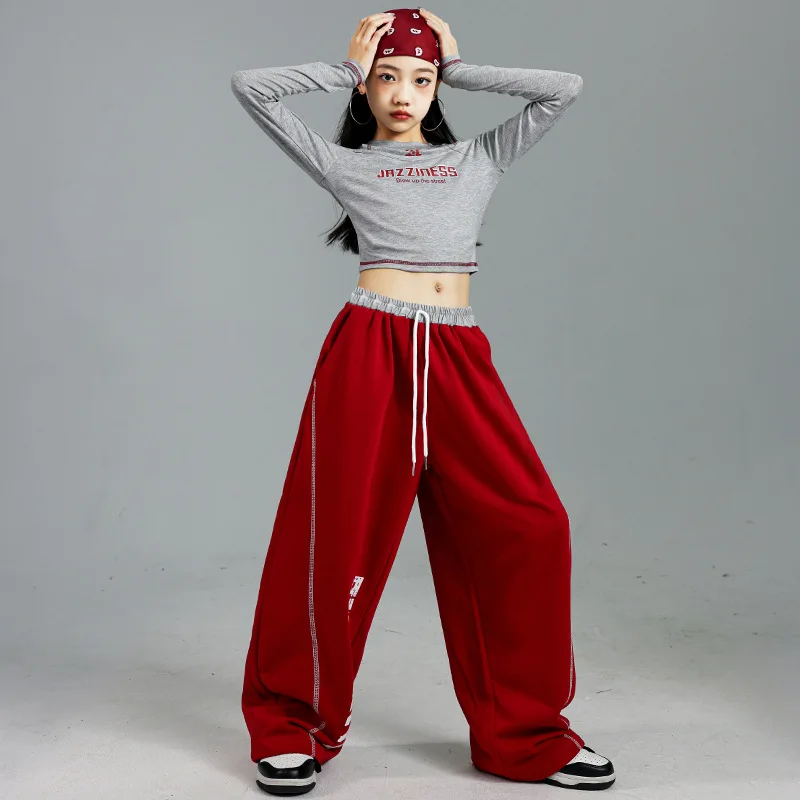 Red Jazz Dance Performance Outfit Long Sleeve Top Children's Streetwear Dance Clothes Trendy Kids' Pants for Girls